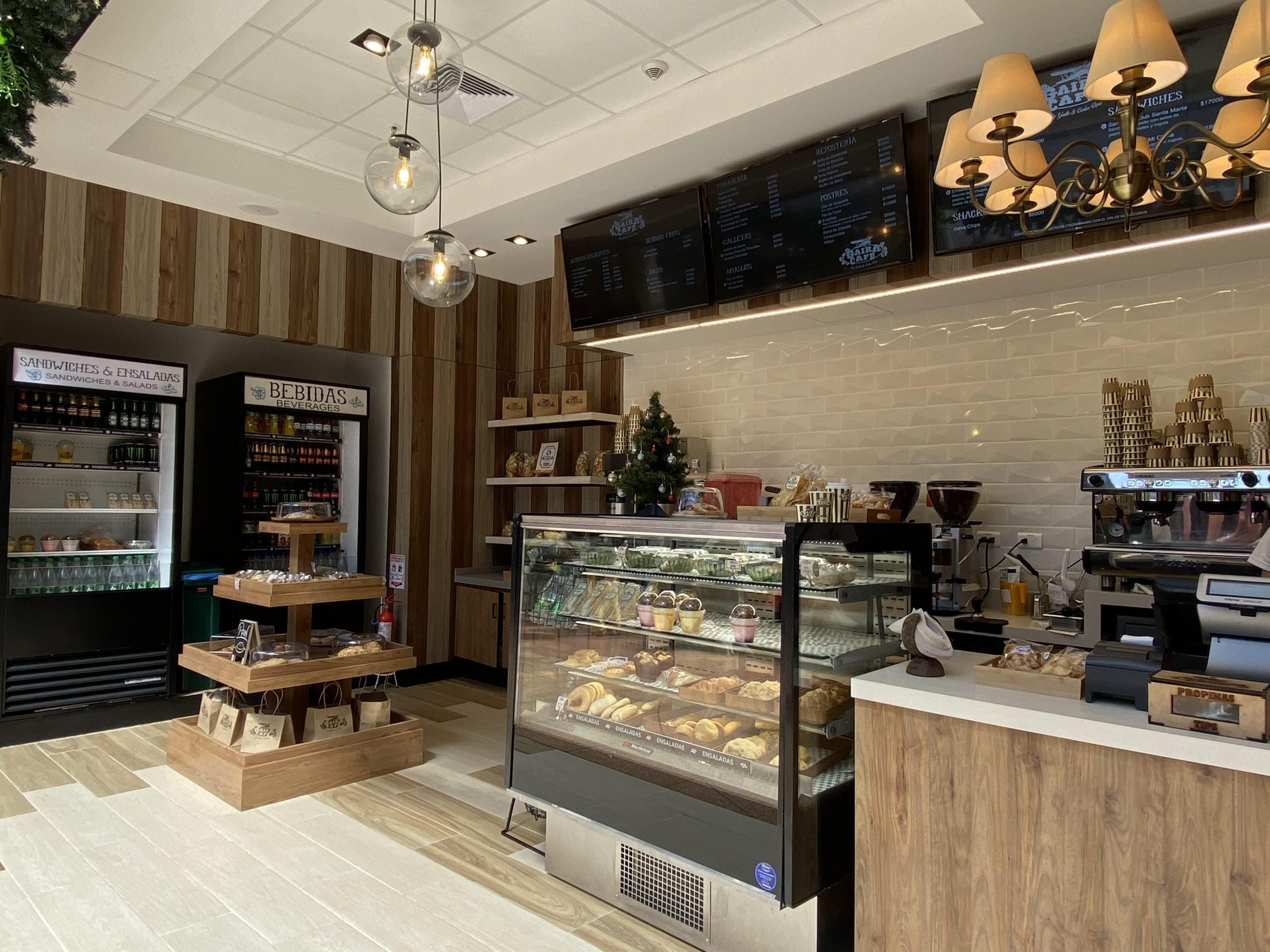 La unión de tres locales en la circulación central de salidas nacionales del aeropuerto, permite conjugar el concepto de café y comidas rápidas de dos franquicias independientes unidas para una operación común.