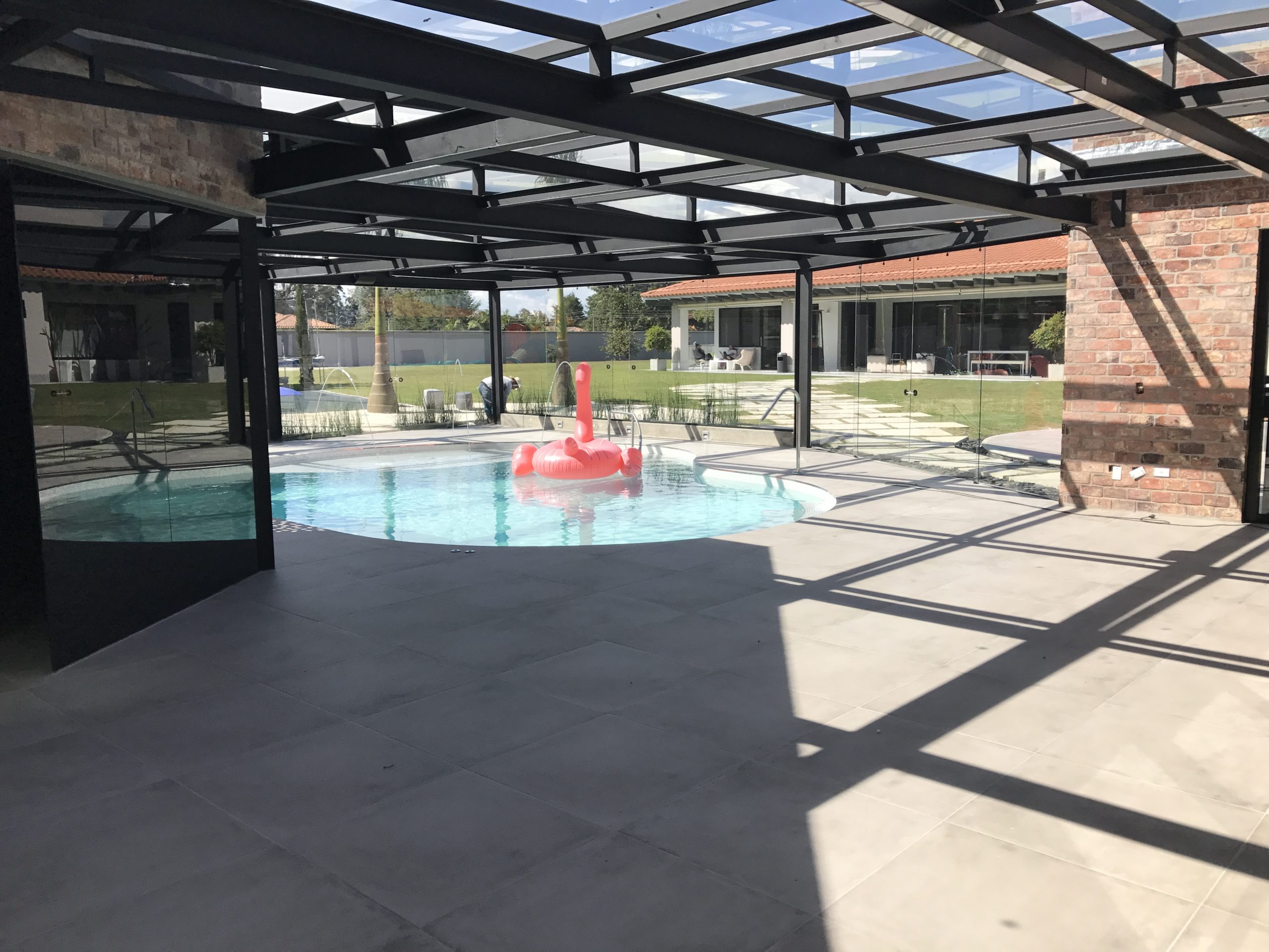 Estructuras en hierro y vidrio, acabados rústicos y metálicos complementan el concepto general.